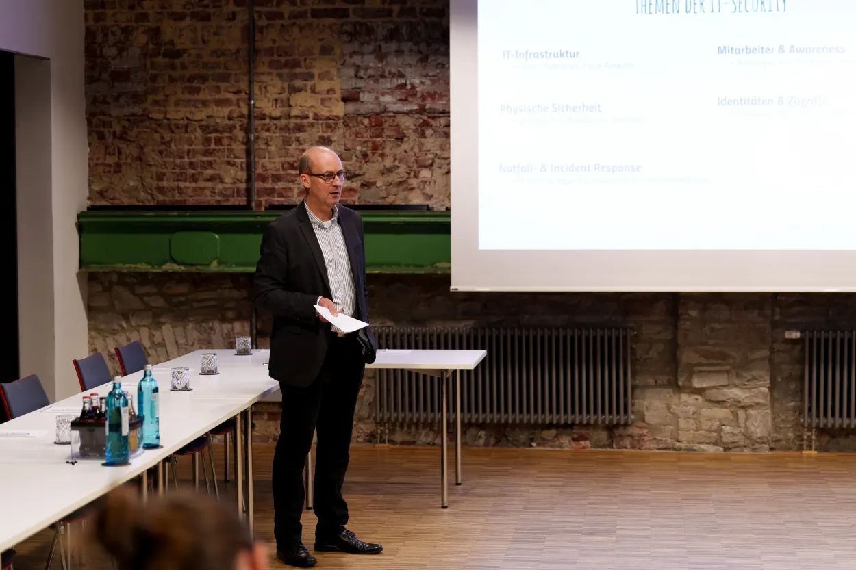 Der Tag begann mit einer kurzen Vorstellung der Referenten durch Daniel Galati. Im Anschluss präsentierten Tobias Onischtschenko und Daniel Galati das Hellmig IT-Security Konzept für KMU und Mittelstand und zeigten praxisnahe Strategien, wie kleine und mittelständische Unternehmen ihre IT-Infrastruktur nachhaltig absichern können.